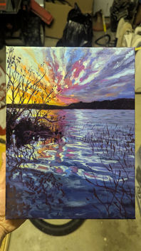 From the Holding a Moment series. This study focuses on the interplay of colour and reflection as the sky moves from warm oranges and yellows into deep purples and blues. Strong contrasts and layered brushwork capture the movement of clouds and the rippling surface of the water, while silhouetted branches frame the scene in the foreground. The result is a painting that holds both the stillness of evening and the energy of light fading across the horizon.